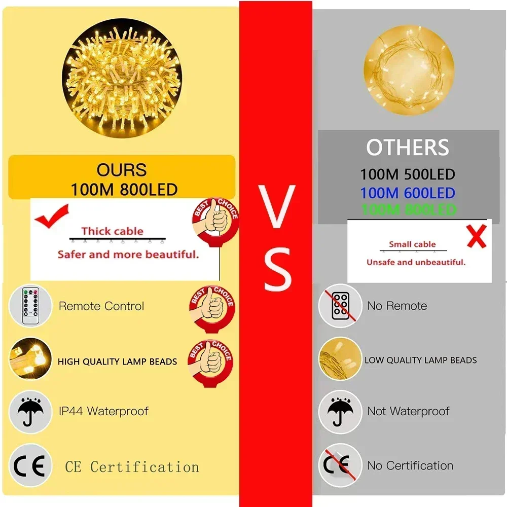 ملحوظة:تحتوي مصابيح 100M في متجرنا على 800 مصباح LED، بينما تحتوي المتاجر الأخرى على 500 مصباح LED فقط. ستكون جودة مصابيح 800 LED أعلى وسيكون التأثير أفضل.