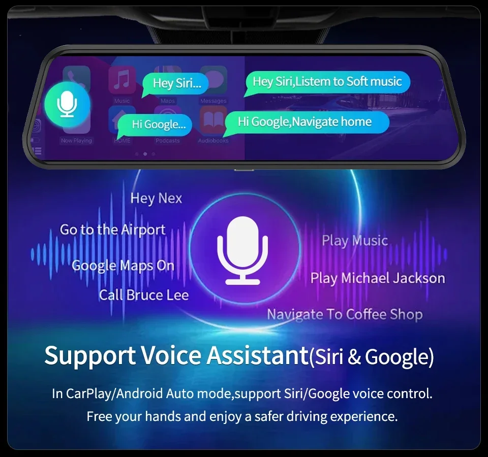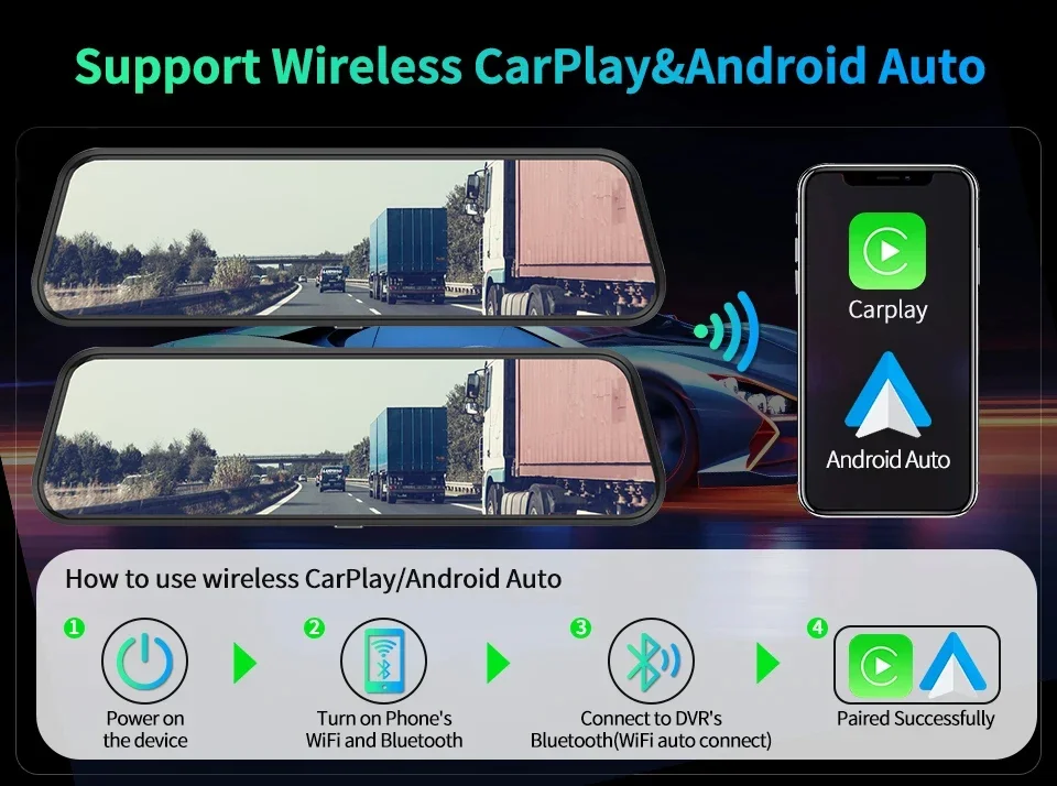 يتصل المنتج بـ CarPlay اللاسلكي وandroid auto عبر البلوتوث، ثم يتحول تلقائيًا إلى WiFi لنقل البيانات. ثم يمكنك استخدام نظام الملاحة GPS، وإجراء مكالمة، واستقبال الرسائل وإرسالها، والاستماع إلى الموسيقى وما إلى ذلك. (يدعم الهاتف المحمول android 10 أو أعلى، ولا يشمل الهاتف المحمول huawei)