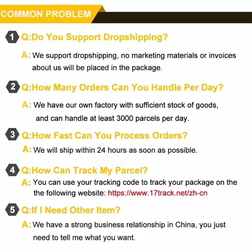 2. نحن ندعم البيع بالجملة والشحن المباشر، وسوف نختار خدمات لوجستية ذات جودة أفضل لإرسال الطرد، وحماية مزدوجة للطرد. إذا كانت هناك أي مشكلة مع الطرد الخاص بك، يرجى الاتصال بنا في أقرب وقت ممكن وسنساعدك في التعامل معها. نحن بائعون صادقون ولن ندع العملاء يخسرون.