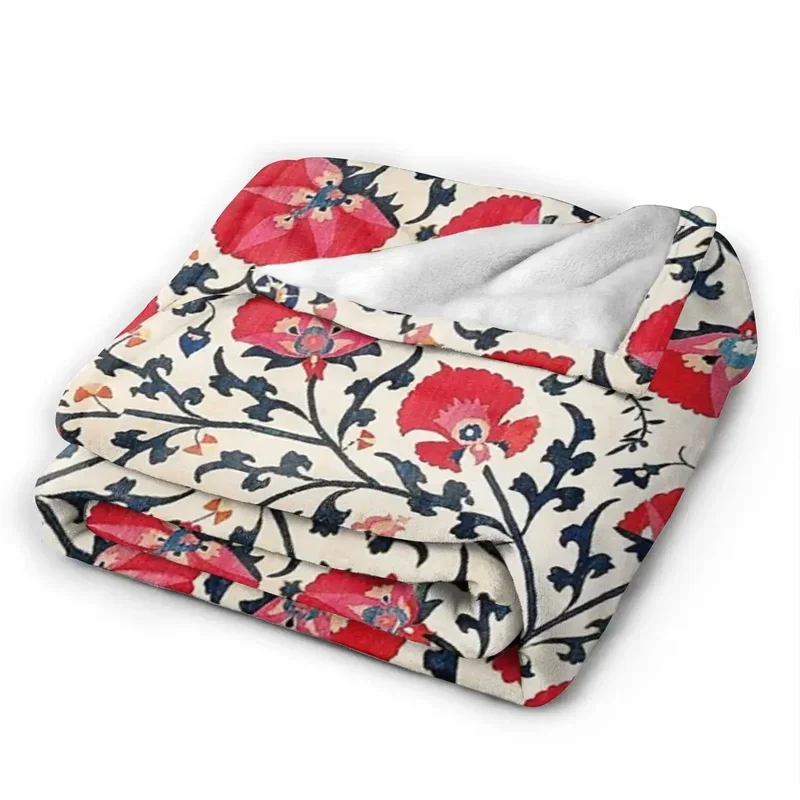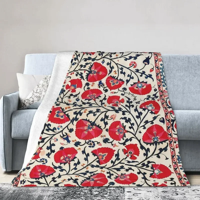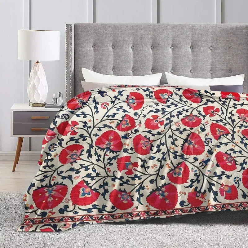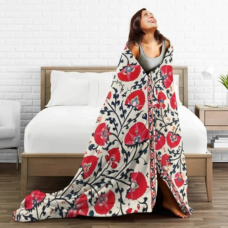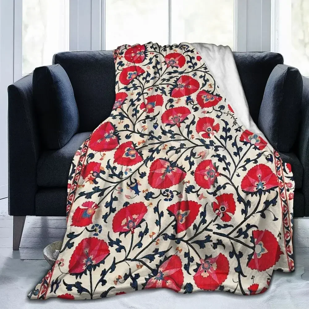 Flannel throw blanket Shakhrisyabz Suzani Uzbek embroidery print blanket bed warm plush blanket bed for picnic travel home
