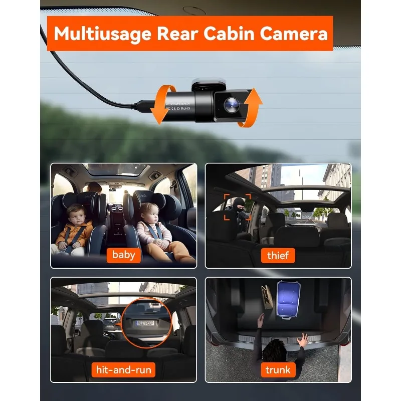[أول كاميرا للمقصورة الخلفية في الصناعة] تلتقط كاميرا المقصورة الخلفية الفريدة المنطقة الكاملة لصندوق السيارة والمقعد الخلفي والنوافذ الجانبية لمساعدتك على مراقبة الأطفال أو الحيوانات الأليفة الجالسين في المقعد الخلفي والأمتعة في صندوق السيارة. مدمجة مع كاميرا المقصورة الأمامية، توفر كاميرا لوحة القيادة ذات القنوات الأربع هذه حلاً مثاليًا لمراقبة الاصطدام والهروب واللص الذي يكسر نوافذ السيارة من الجانبين، مما يمنحك راحة بال إضافية عند القيادة وركن السيارة.