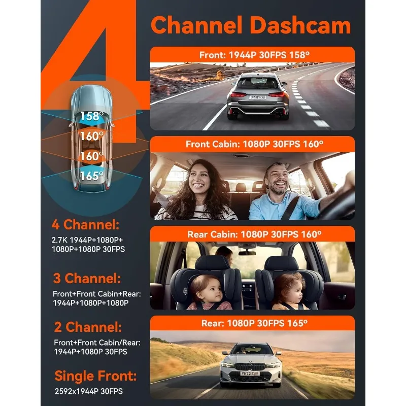 [تسجيل بزاوية واسعة 360 درجة بأربع قنوات] تم اعتماد معالج ثنائي النواة، أول كاميرا لوحة قيادة رباعية القنوات في العالم مع كاميرا أمامية 158 درجة وكاميرا أمامية للمقصورة 160 درجة وكاميرا خلفية للمقصورة 160 درجة وكاميرا خلفية 165 درجة يمكنها تسجيل الجزء الأمامي والخلفي والمقصورة وجوانب السيارة في وقت واحد، مما يحقق تغطية 360 درجة رائدة بدون نقاط عمياء بدقة قصوى تبلغ 2.7 كيلو بايت (1944 بكسل) + 1080 بكسل + 1080 بكسل + 1080 بكسل، حماية 4x، حماية كاملة 360 درجة. وضع تسجيل مختلف (1 قناة / 2 قناة / 3 قنوات / 4 قنوات) لتختار بحرية حسب الحاجة.