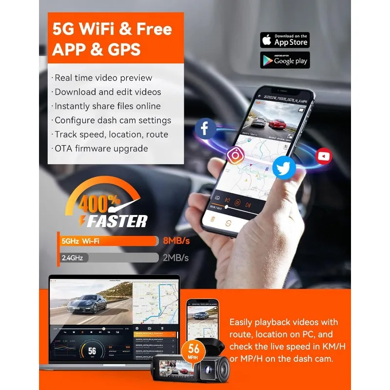 [ترقية 5G WiFi & GPS & OTA] مع 5G WiFi ووحدة GPS ثنائية النظام، تتميز كاميرا لوحة القيادة ذات العدسات الأربع هذه بسرعة نقل أسرع 4 مرات ووظيفة تحديد المواقع الأكثر دقة. تتيح لك ضبط الإعدادات والمعاينة والتحرير والمشاركة عبر الإنترنت وتتبع الموقع والسرعة المباشرة بالكيلومتر/الساعة أو الميل/الساعة والطريق عبر تطبيق Vantrue المجاني. بنقرة واحدة لتنزيل تقارير تحليل الأميال التي تعمل كدليل حاسم بعد حوادث الطريق. تمكنك ترقية OTA من تحديث إصدار البرنامج الثابت مباشرةً عبر التطبيق. سهل وفعال.