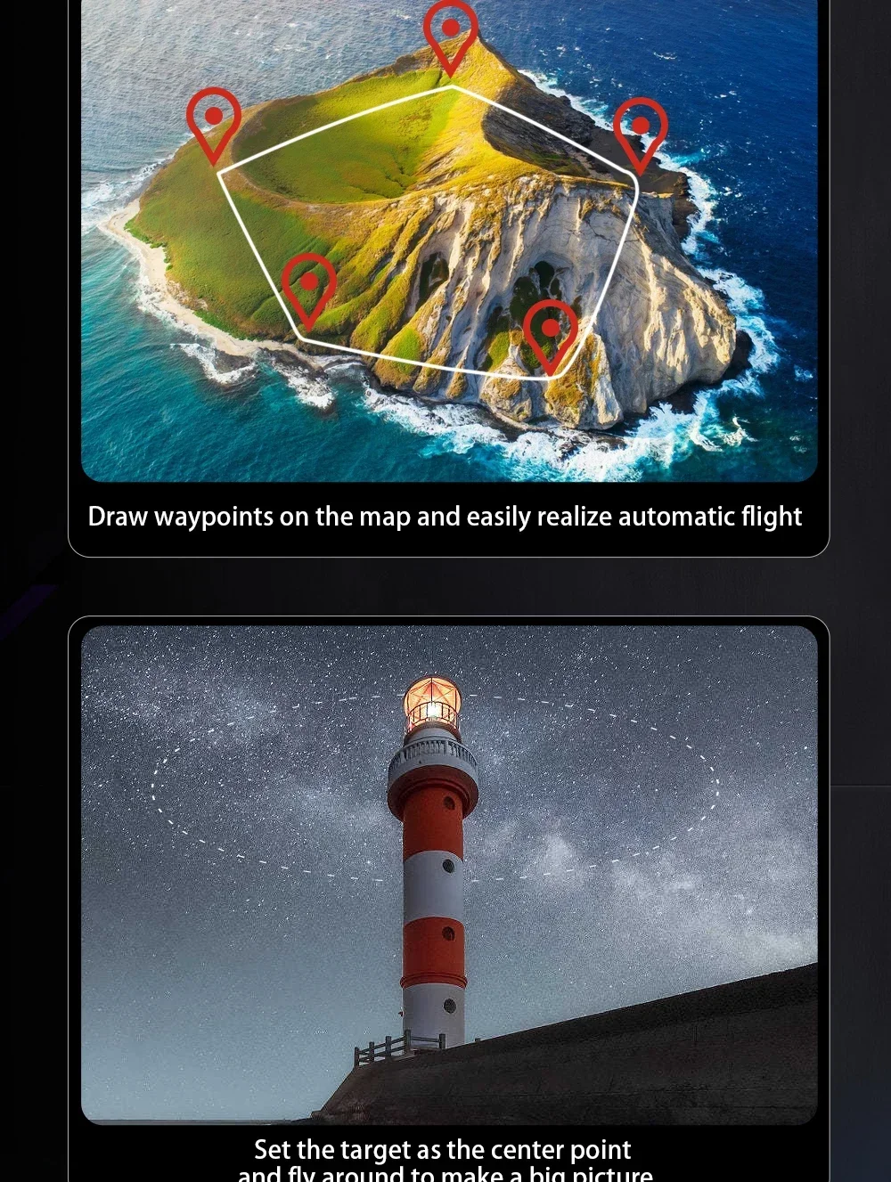 3. ①GPS intelligent follow; ②Image follow: identify the subject and automatically follow the flight