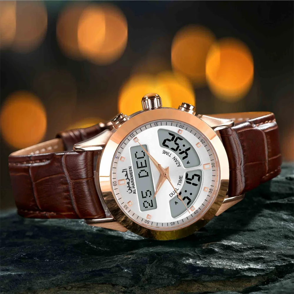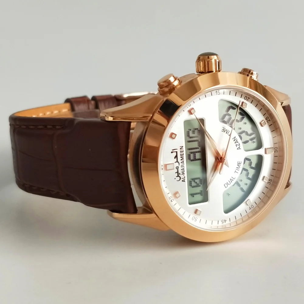 Muslim Watch with Alfajr Azan Time Iqamah Alarm for All Prayers English Arabic Language Saphire Genuine Leather Ramadan Gift