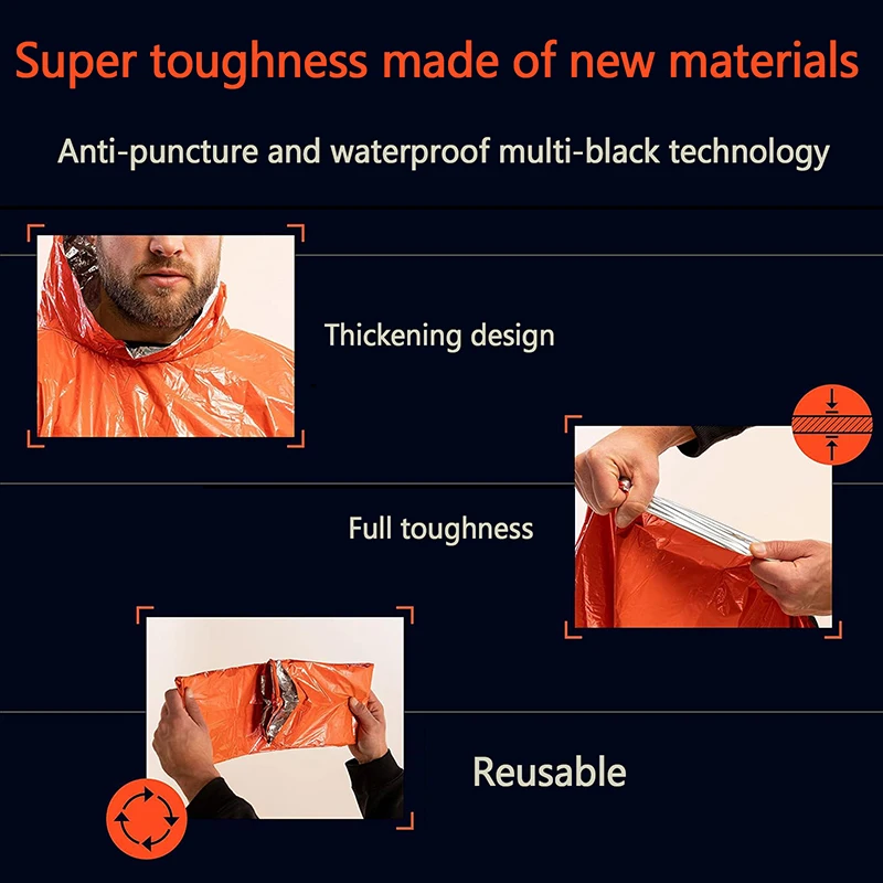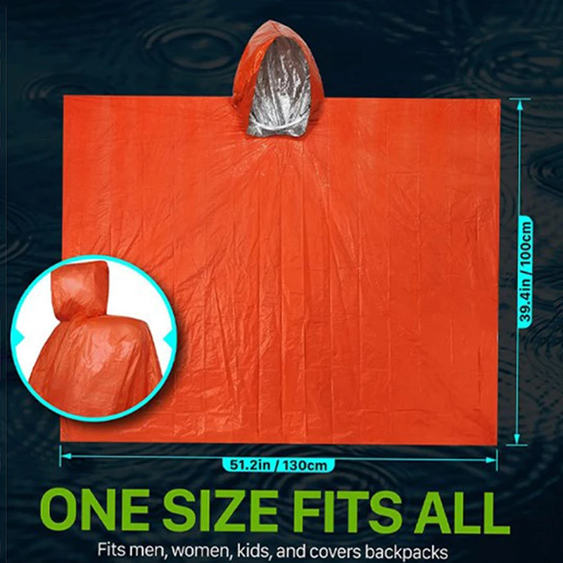 Emergency survival rain poncho & blanket:When bad weather comes, rain poncho will keep you dry, clean, and safe. The rain coat can serve as an emergency blanket, help prevent hypothermia, and is waterproof and windproof.